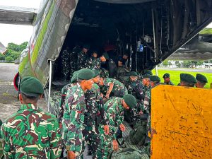 PENGAWALPERSADA.COM, Jakarta-TNI Angkatan Udara mengerahkan empat pesawat angkut untuk memberangkatkan prajurit Batalyon Infanteri Teritorial Pembangunan 899/Bata Satya Gardapati (Yon TP 899/BSG) ke Sumatera Utara, Minggu (14/12/2025). Pengerahan ini dilakukan sebagai bentuk dukungan percepatan pemulihan wilayah terdampak bencana.